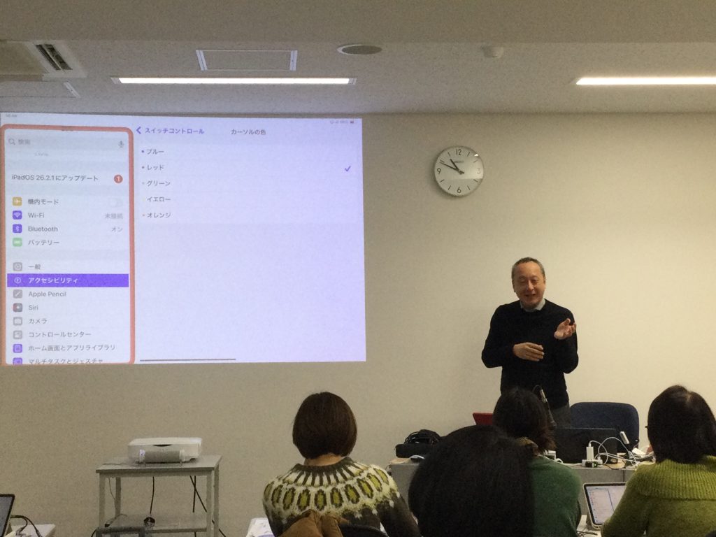 参加者全員がiPad+接続機器+スイッチを手に、スイッチの接続からスイッチコントロールの設定を一緒に学び、高橋さんが開発したコミュニケーションアプリ「指伝話メモリ」のカードを操作してみました。